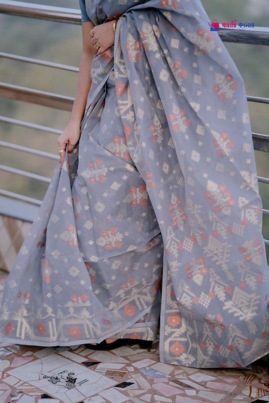 – শাড়ি জুড়ে রয়েছে নান্দনিক ফুল ও ক্লাসিক জামদানি বুটি মোটিফ, যা শাড়িটিকে দিয়েছে সফট অথচ এলিগেন্ট লুক।