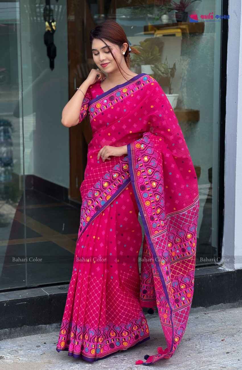 🔸 সুন্দর সুতার ও এম্ব্রয়ডারির কাজ: পুরো শাড়িতে সূক্ষ্ম হাতে কাজ করা নকশা