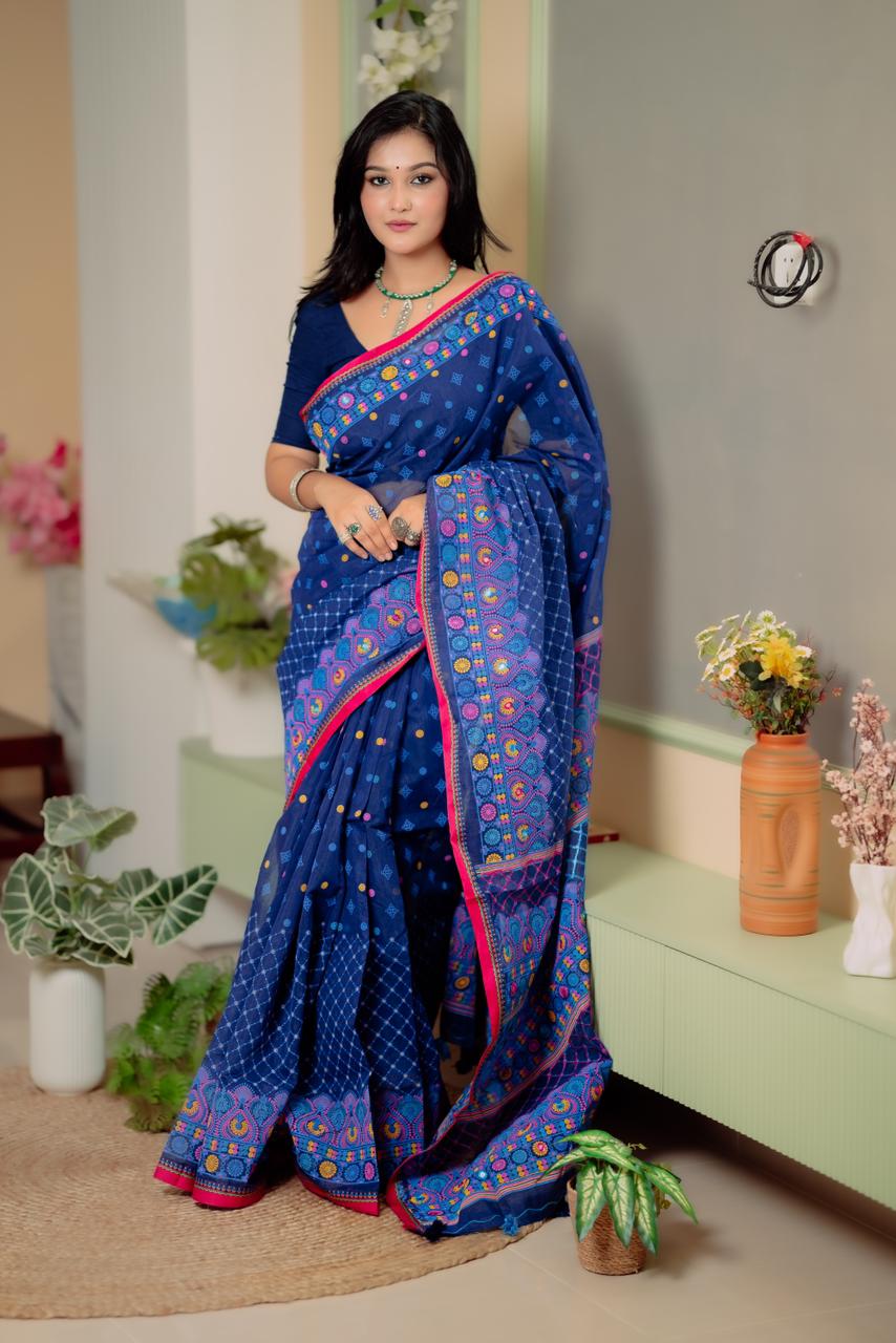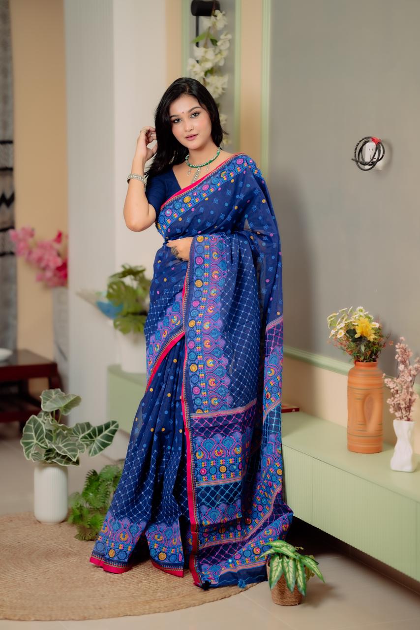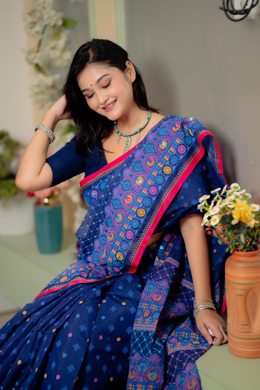 🔸 সুন্দর সুতার ও এম্ব্রয়ডারির কাজ: পুরো শাড়িতে সূক্ষ্ম হাতে কাজ করা নকশা